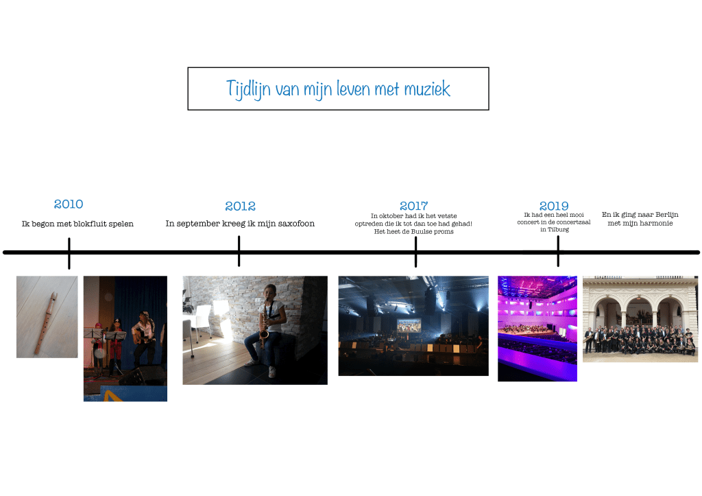 Hier zien jullie een tijdlijn die gaat over mijn leven met muziek. Ik heb de leukste dingen op een rijtje gezet die ik in deze jaren heb meegemaakt. Veel leesplezier!